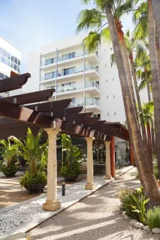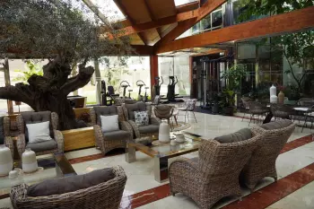 Helle Empfangshalle mit Olivenbaum, chilliger Garten mit Bali‑Betten und zwei bis drei Pools, inklusive Indoor‑Bereich