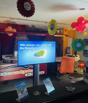 Über unseren großen Berater-Bildschirm können Sie sich Bilder, Landkarten und wichtige Informationen zu Ihrem Urlaubsziel anschauen.